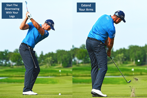 I like to fully release and extend my arms through impact. This increases leverage and helps push the club down and through for a solid strike. You’ve got to hit down to compress it and downward force takes away rotational force, so the face will stay squarer.